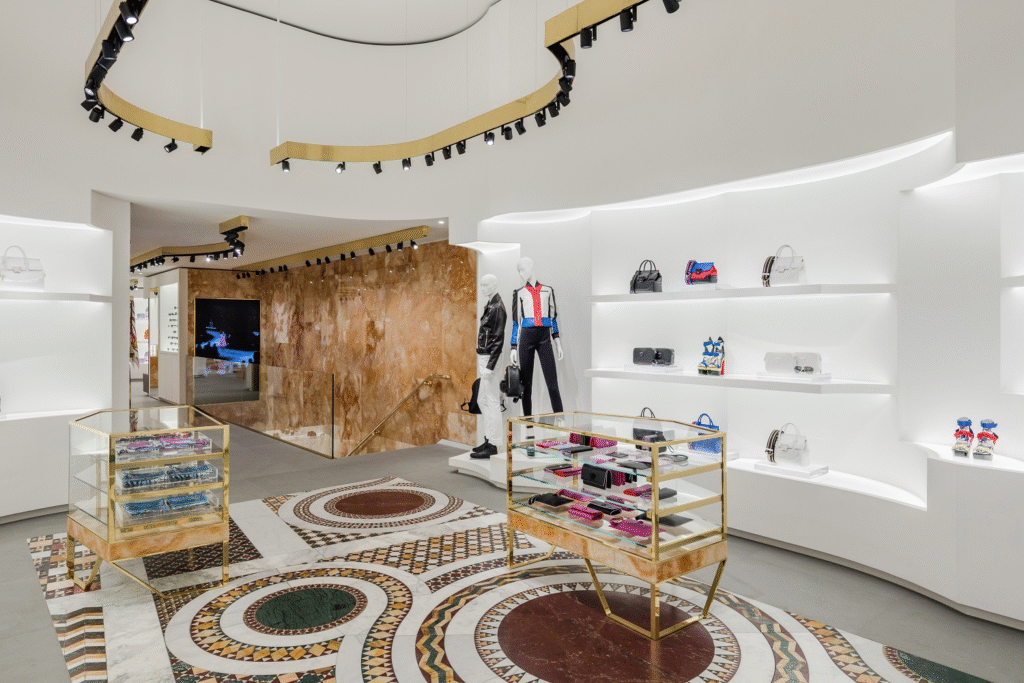 O chão imita os mosaicos bizantinos das igrejas do século IX, realçados pelos dourados dos cabides e expositores e peça enorme parede de mármore que acompanha a escadaria. A decoração reflete o luxo que carateriza as coleções de Donatella Versace. Nesta loja encontra as carteiras e acessórios da marca e toda a coleção de pronto-a-vestir da griffe.